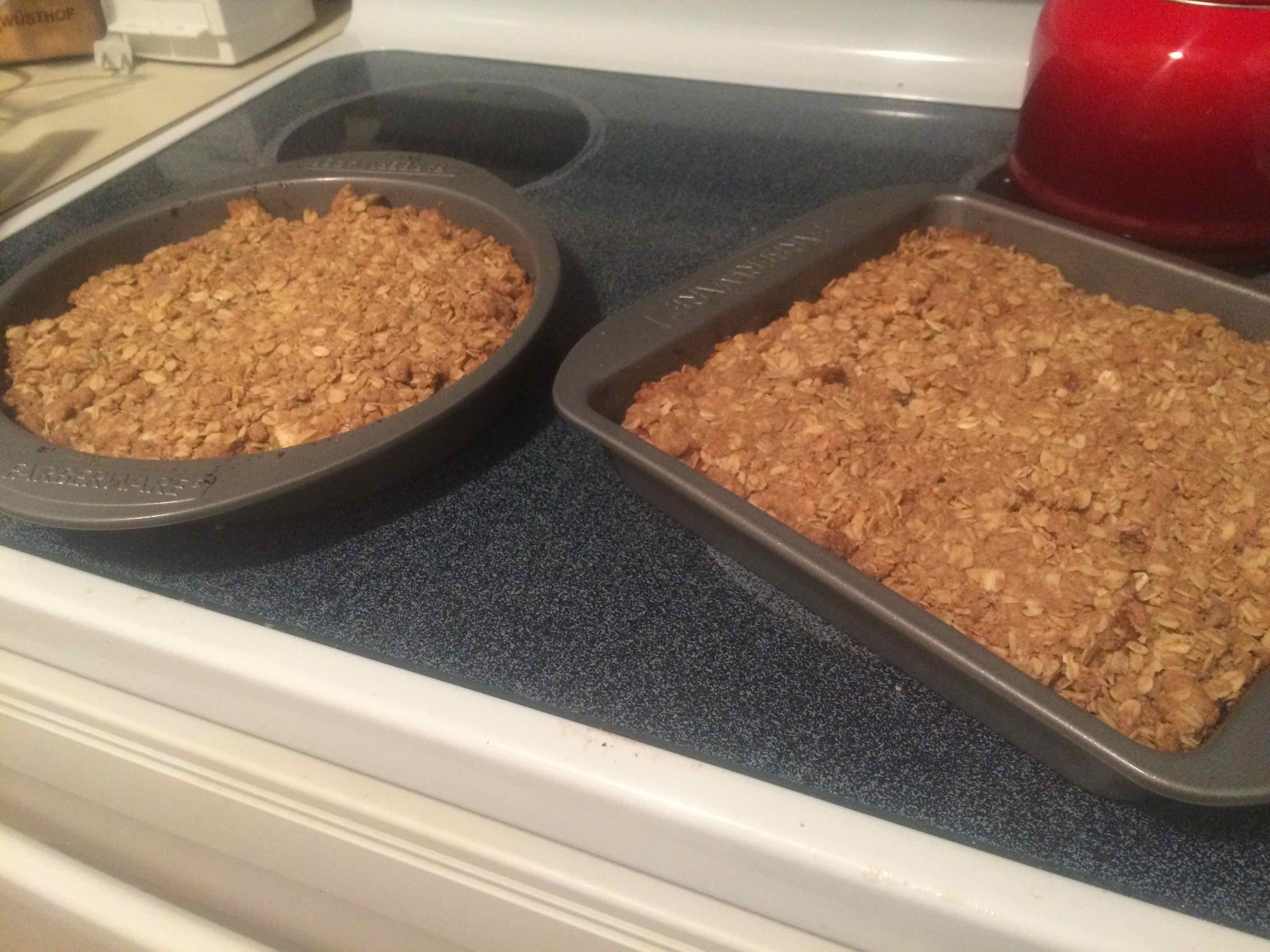 There were 3 separate parts to this recipe - the crust on the bottom, the apple filling and the crumble on top. The crust needed to bake for a while before, and it got a little bit overdone because of my electric oven and I forgot to peel the apples, but the bars turned out well.